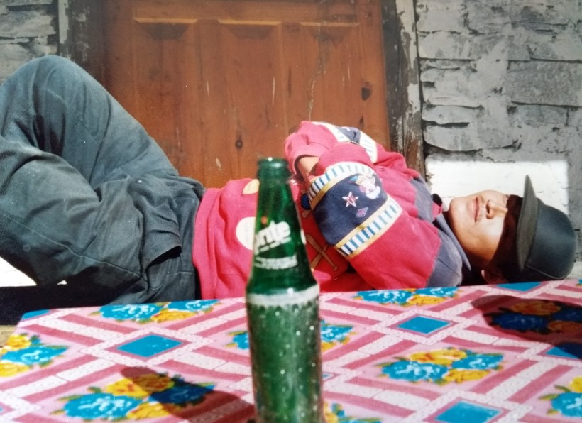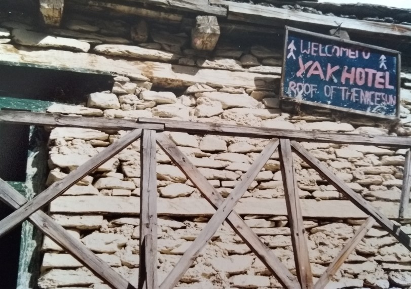 We moved to the table to eat. I tried fried potatoes and yak cheese as recommended by mad Madu. Delicious! Beth, as always, caused local angst by ordering nothing but a bowl of boiling water. She was lugging vast amounts of packet soup and muesli, preferring not to risk the local nosh. I don’t know how she walked for 7 hours a day on it. I was almost permanently starving. Over dinner Jyoti and Baishali enlightened us a little about the caste system amongst Nepal’s Hindus. They admitted it was a lousy system. They were both Brahmins, the highest caste and told us that you could always tell Brahmins by their long noses. The conversation took a gory turn when they explained that because Hindus are always cremated, there was a severe shortage of bodies donated to medical science. This means that medical students have no conveniently formeldihyded bodies to study and practise on. Instead they have to go out and find their own. The only ones available come from unclean graveyards. Yuck! It’s hard to imagined Jyoti and Baishali, who seem such genteel young girls, going out with a shovel to rob graves as part of their course. Before I had nightmares, I moved back to the fire to write my diary in the company of the family elders peacefully spinning their prayer wheels and muttering ‘Om mani padmi hum’ – ‘the jewel in the heart of the lotus’. No-one seems to know quite what that means but I felt really privileged to be in a remote mountain village being part of all this.